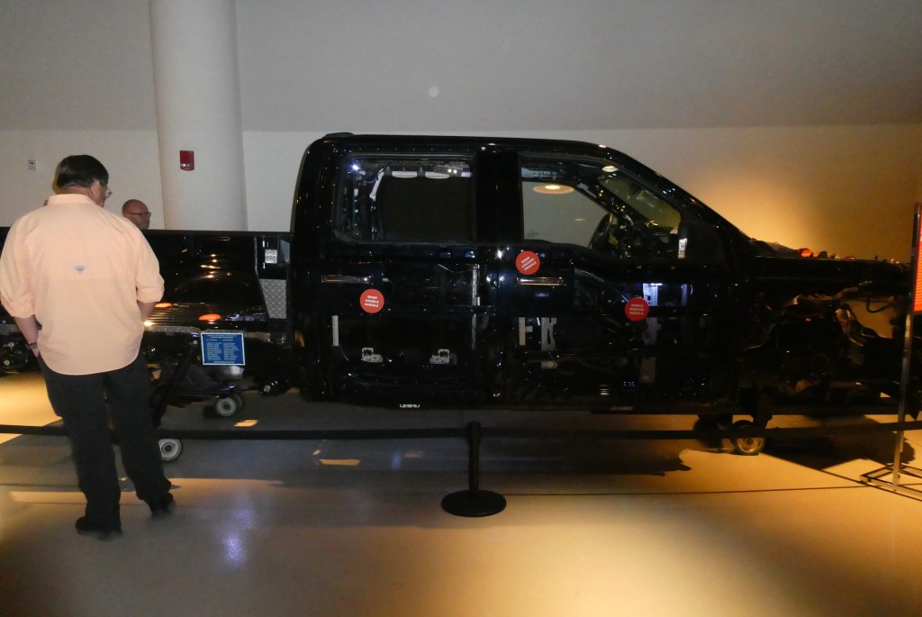 We explored some of the exhibits in the visitor center and Randy looked over the 2021 Hybrid F-150. This truck is a pre-production version of the hybrid model of the F-150. It combined a 3.5-liter turbocharged V-6 with a lithium-ion battery and 35-kilowatt electric motor, producing 430 horsepower. The hybrid engine has 20% better fuel economy. Ford Truck customers are able to choose the powertrain that most suited their needs – gas-powered internal combustion engine, hybrid gas-electric or full electric. My original research didn’t find that the hybrid F-150s were available but reader Mark has seen and driven a hybrid. Cool!