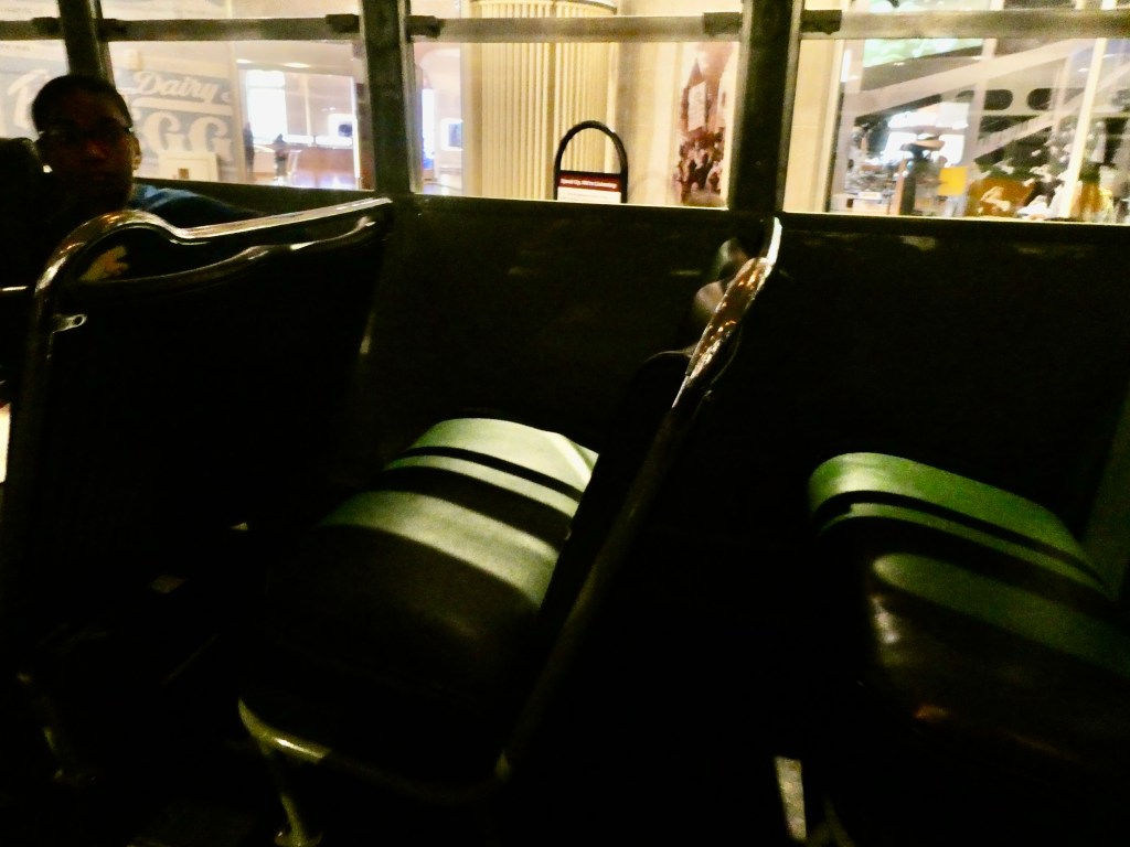 This was the seat Rosa Parks was sitting in.  We were at the Henry Ford on a weekday in May and there were many school groups on field trips.  We were delighted to see and hear that the students on the bus were very knowledgable about the event and almost all wanted to sit in the very seat.