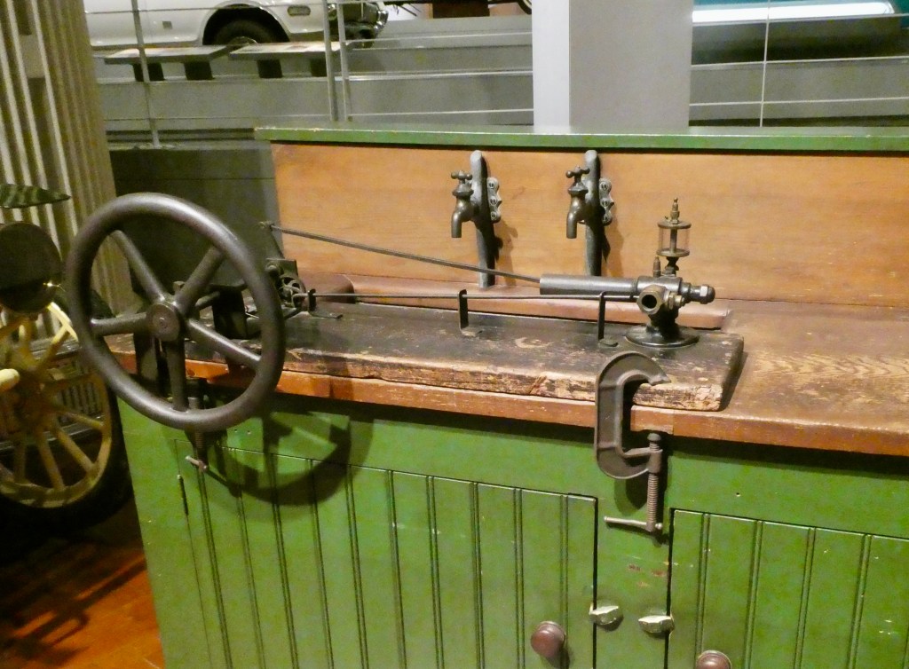 One final item is Henry Ford’s Kitchen Sink Engine. Text from the display states:  “On December 24, 1893, Henry Ford carried his first experimental engine, made from bits of scrap metal, into the family kitchen and clamped it to the sink. His wife, Clara, fed gasoline to the intake valve while Henry wired the spark plug to an overhead light and spun the flywheel. The little engine coughed and then roared to life.”