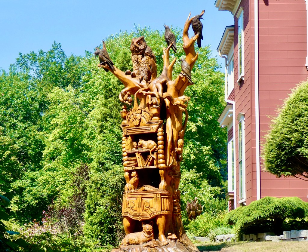 The sculpture in the yard was commissioned by Tabitha King. Artist Josh Landry used a chain saw, and worked for one month, to form a sculpture featuring books and animals out of the stump of a dead 300 year old ash tree.