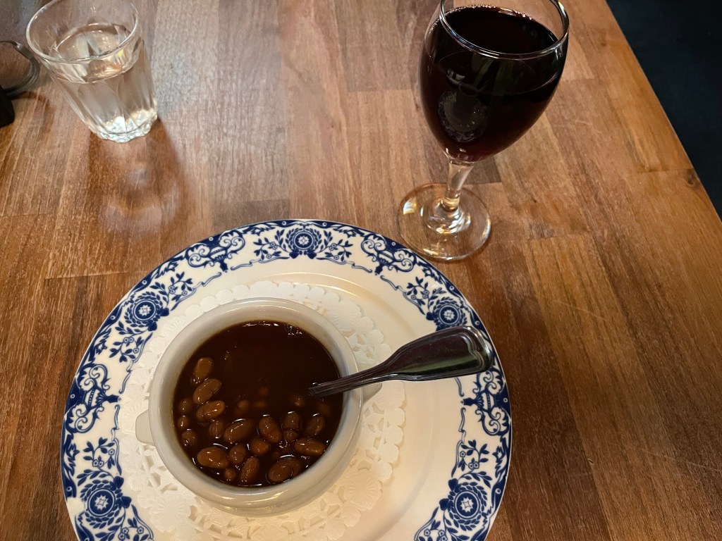 My meal started with the most DELICIOUS beans and a glass of wine.