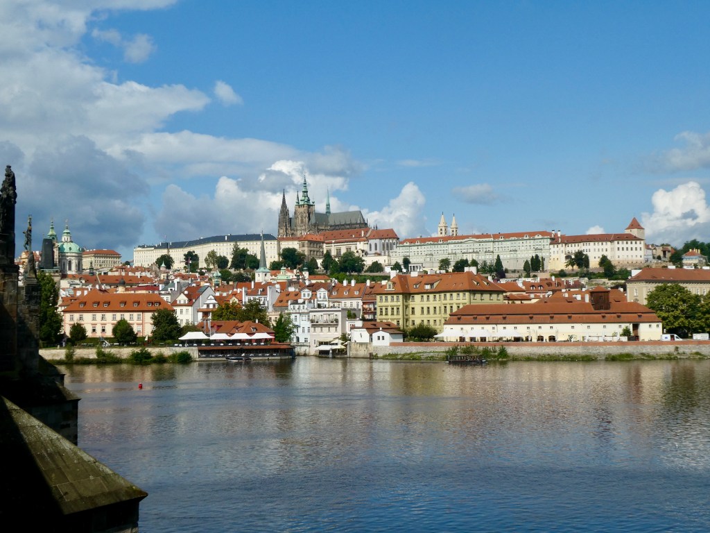 From a distance we can see Prague Castle. The complex actually holds four castles, built from the 9th to the 18th centuries. It is the largest ancient castle complex in the world. The four castles include the old royal palace, Queen Anne’s summer palace, the Lobkowicz Palace and the new royal palace. There are also a number of other churches and buildings on site.