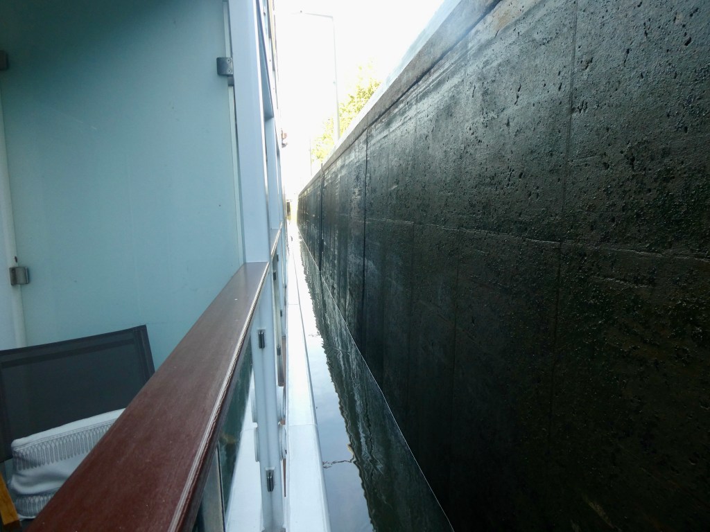 The best place to be, in my opinion, was our balcony. I could reach out and touch the concrete as we went down about 18 feet in that first lock!