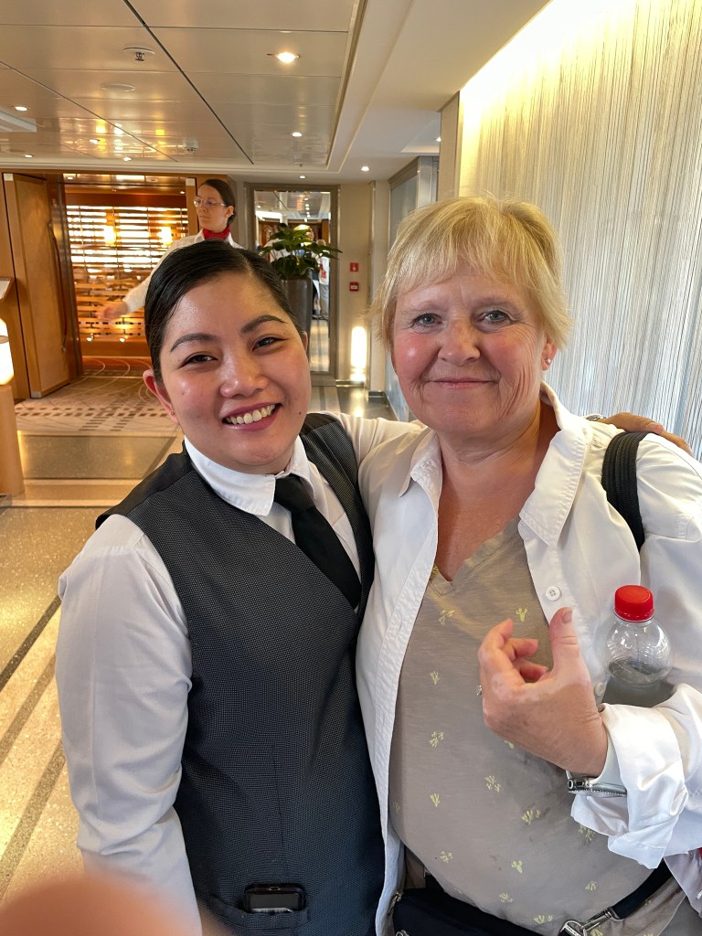 We said goodbye to the sweetest wait person Kristhina. We had connected with her several times and learned about her two year old son at home in Manila with her mother. Her husband is working on the Celebrity cruise line.