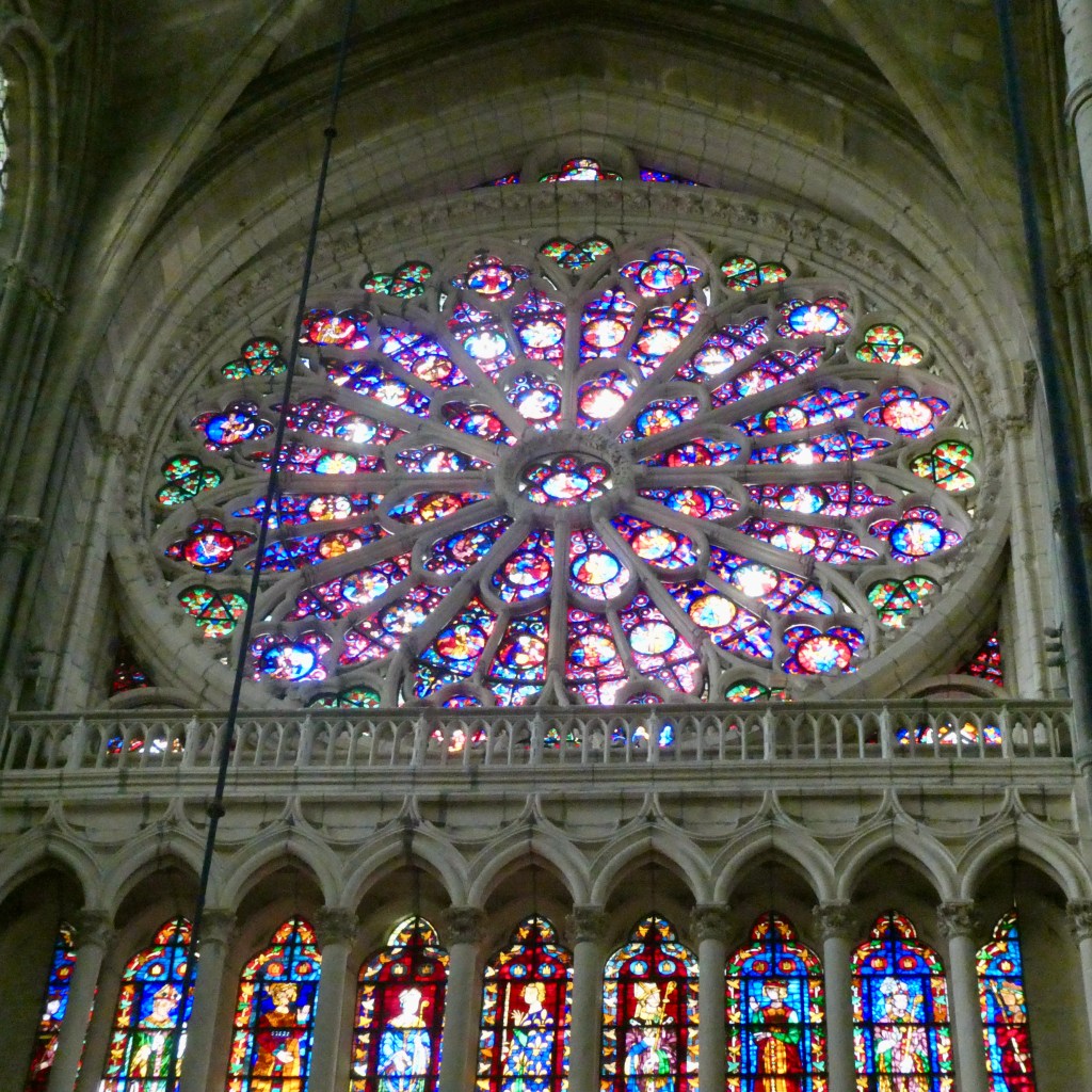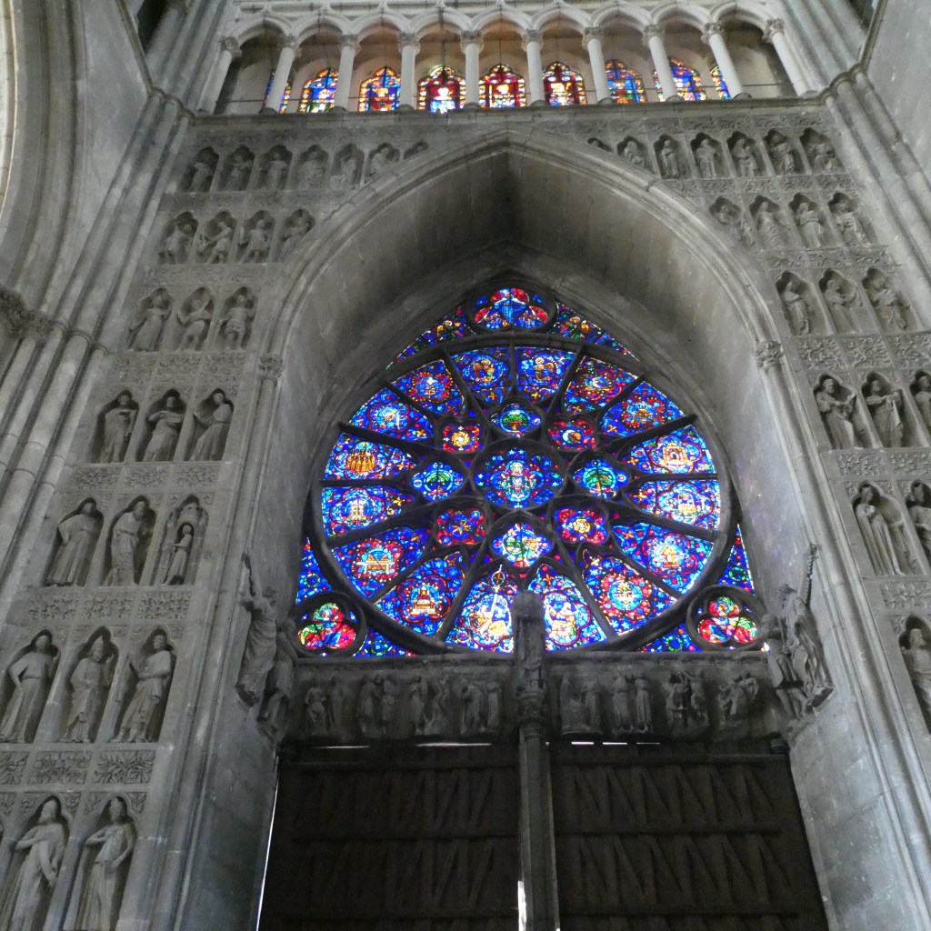 This is the rose window from the inside. Stained glass is very prominent throughout the cathedral.