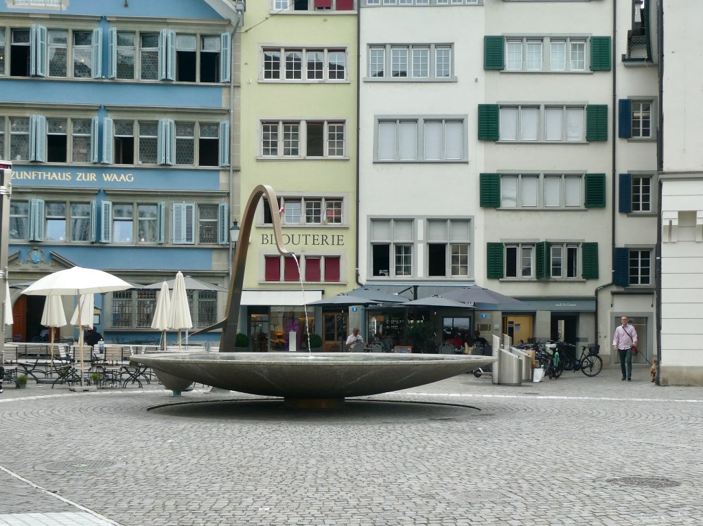 Zurich has the most fountains of any country in the world. The water is drinkable and people fill water bottles from them.  It is also considered an emergency service water source. The side arm on the fountain sometimes provides wine.