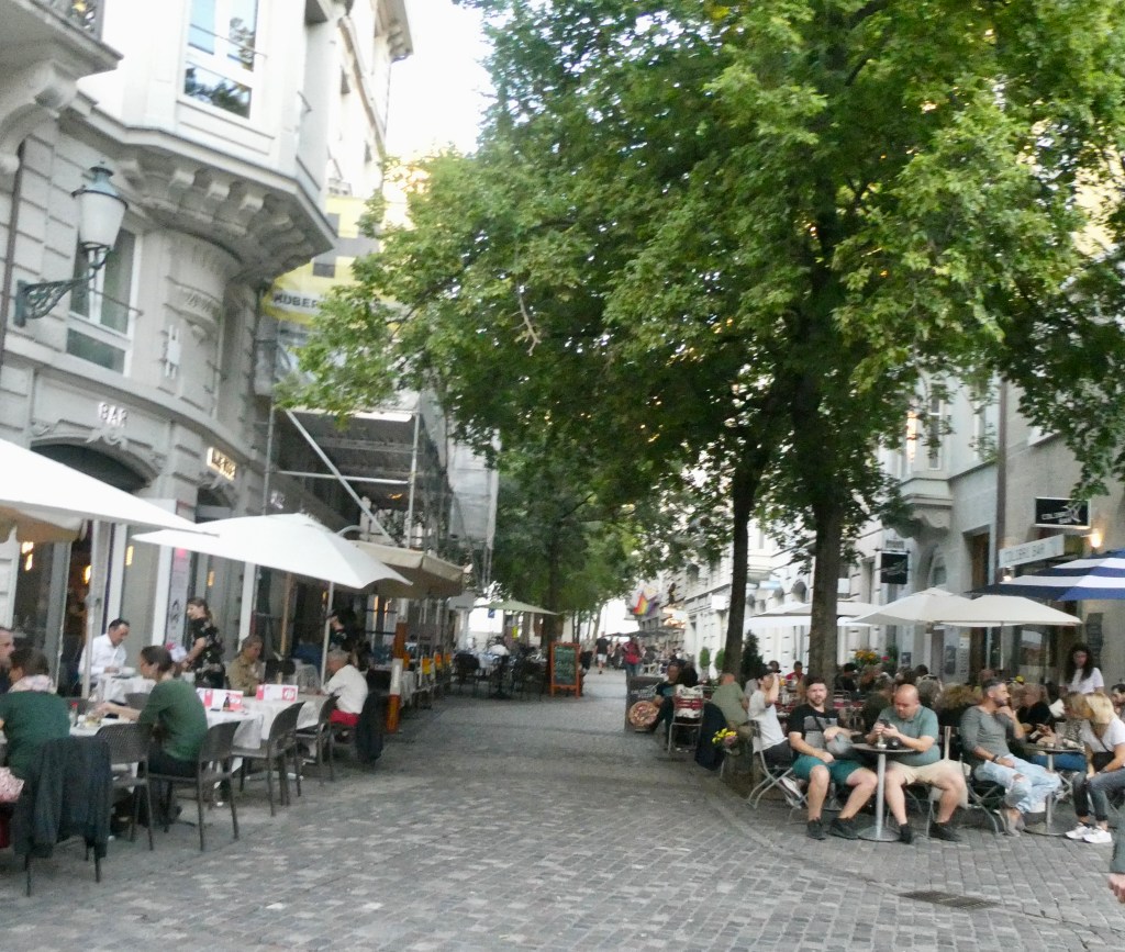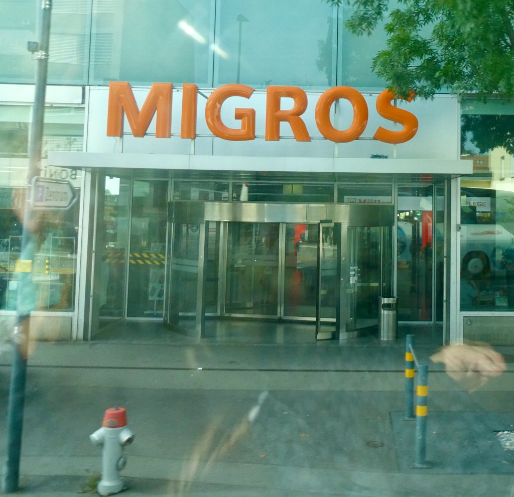 This is another poor drive by picture – this time of a Migros grocery store.  Migros is a large grocery chain in Switzerland.  By policy, they do not sell alcohol or cigarettes but someone is selling lots of cigarettes!  There is so much smoking. There is very little trash around Zurich but 90 percent of what there is are cigarette butts.   All restaurant tables, inside and out, have ashtrays.  We moved from where we were sitting several times to avoid smoke in just a few days!