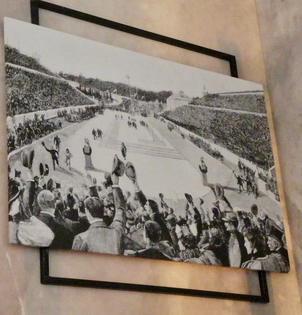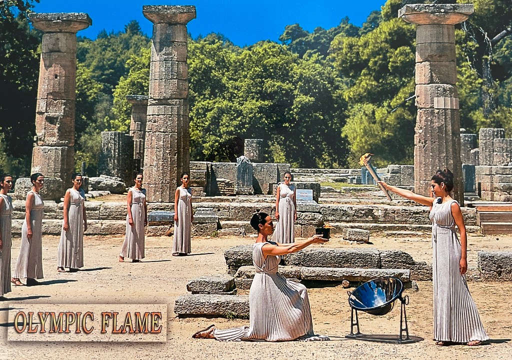 These days the torch begins in the stadium in Olympia, then goes to Athens and to the world beyond. We didn’t see this re-enactment. It is a picture of a postcard we bought.