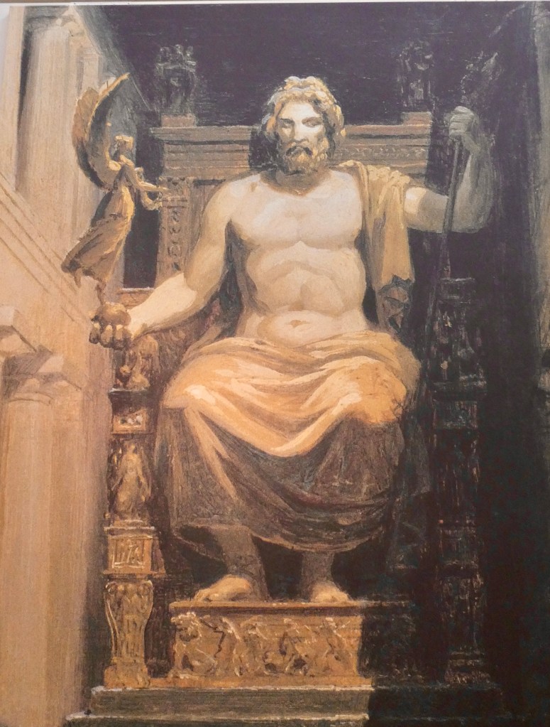 The original statue of Zeus was made of gold and ivory. It was taken to Constantinople at some point and disappeared.