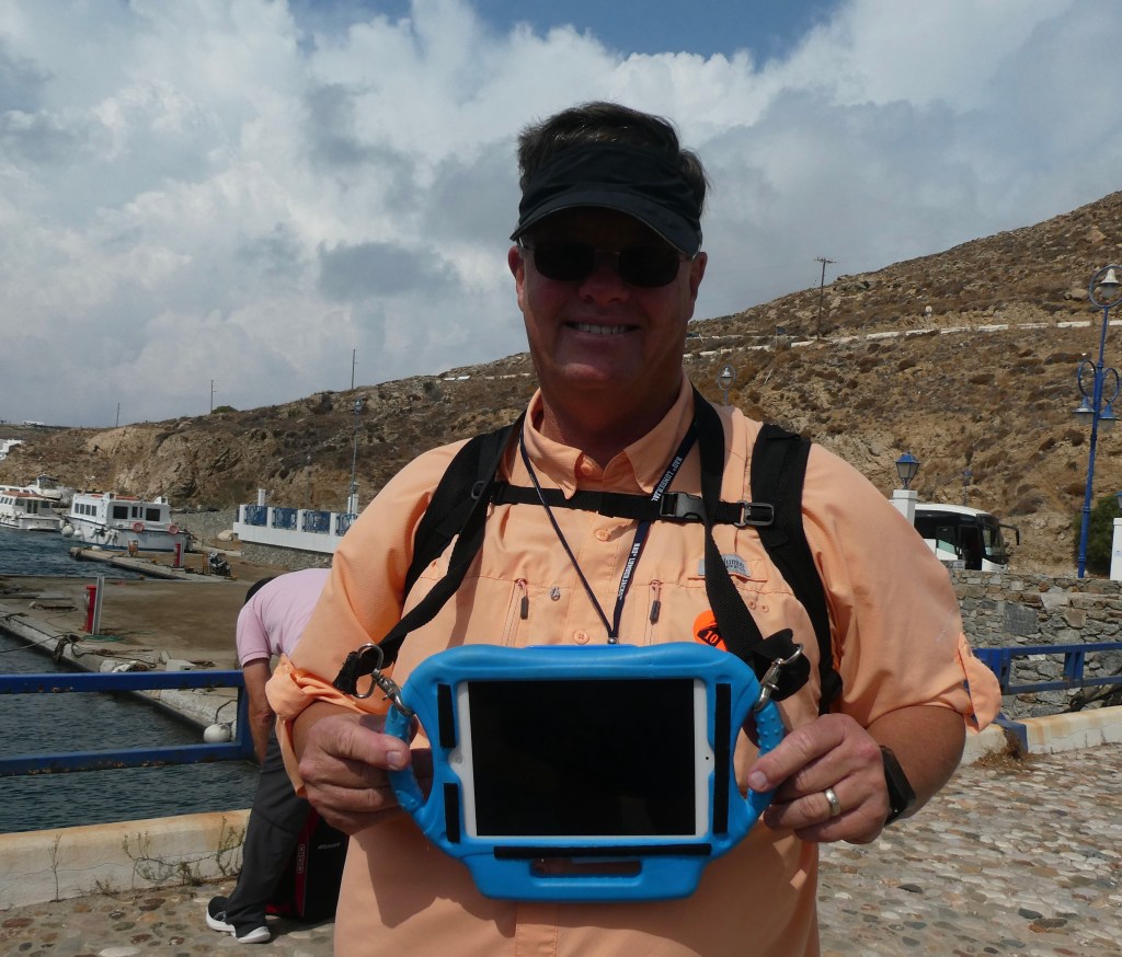 With background absorbed, we were ready to explore Delos with our guide and with the aid of Augmented Reality Software tablets. Our tour description said “AR combines the camera’s content with a virtual one. AR essentially enables you to simply point the tablet’s camera at various locations of the site and view them in their original form, as they once stood thousands of years ago.”
