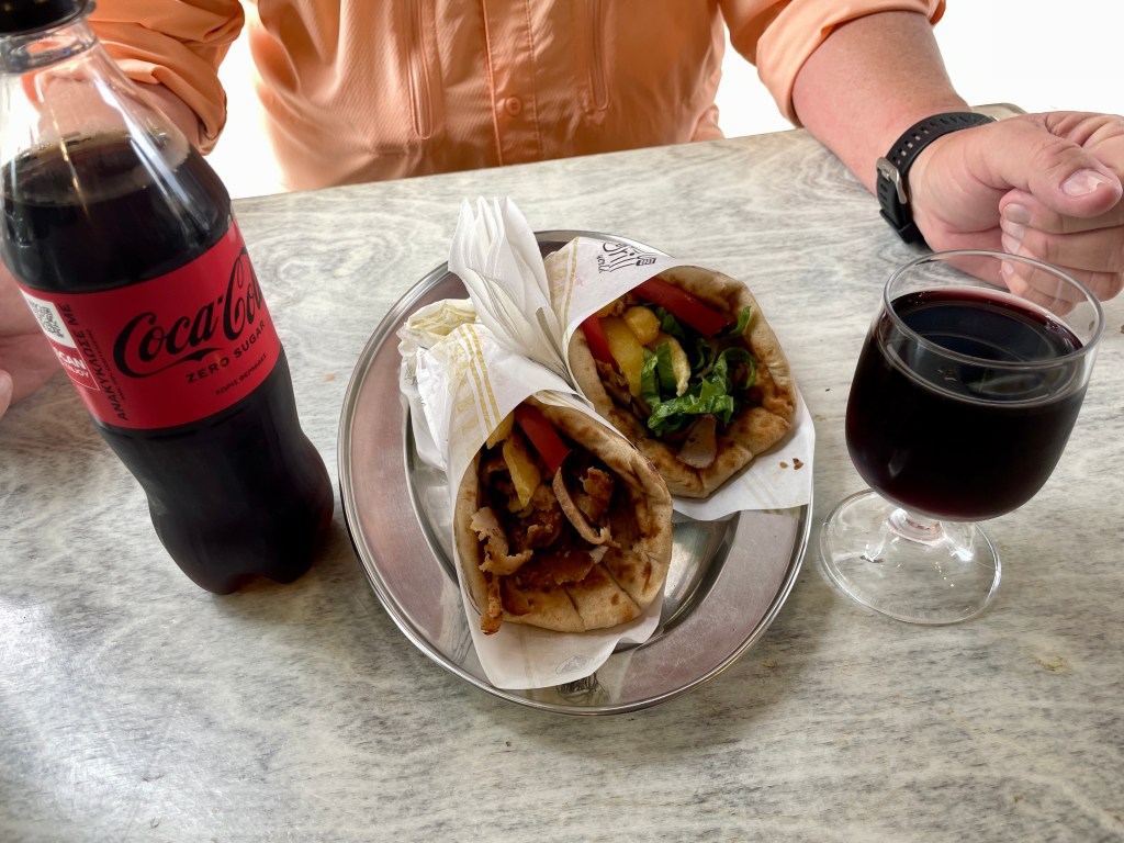 We were on our own for lunch. We ordered 2 gyros, 1 coke, 1 glass of wine and paid the equivalent of $10.94. We found every thing in Athens to be very economical as a tourist.
