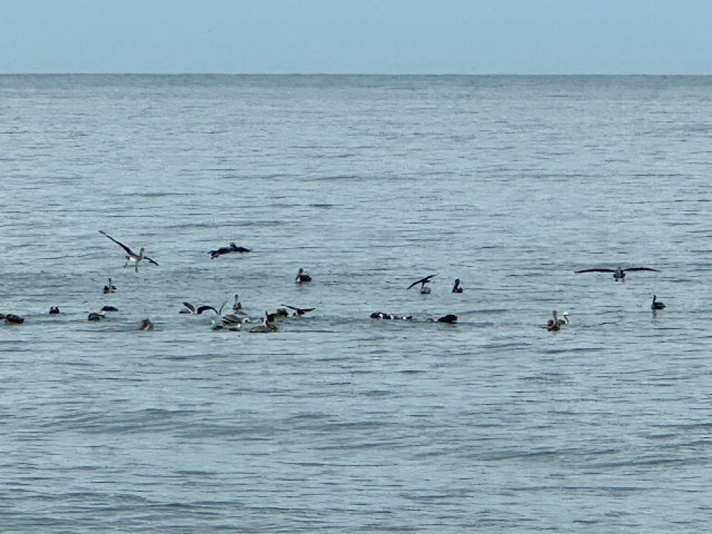 On this morning we saw several groups of sea birds aggressively move from area to area after fish.  We asked the waiter about the type of fish. As best we could understand, he was saying “pardo” but we found no fish with that name doing a bit of research. It could have been a language snafu, or a regional name of a type of fish. Who knows?