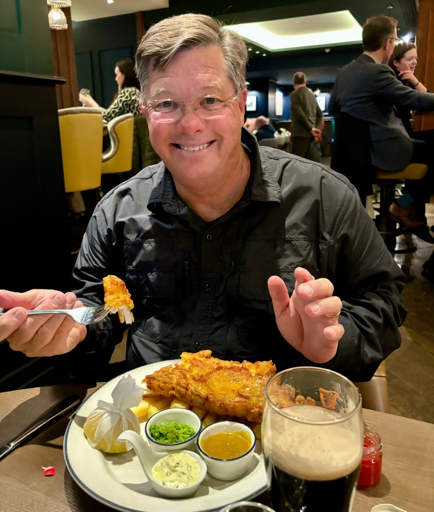 Randy had missed out on authentic pub fish and chips on both of our previous “visits” to London so he knew exactly what he wanted. Jo and Flynn ordered the same. I don’t eat fish, even fish and chips in London.