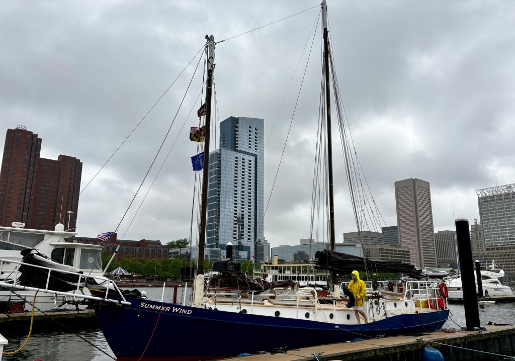 The pre-purchased event for our first morning in Baltimore was a sail around Baltimore’s Inner Harbor on the Summer Wind. When we arrived we were offered a refund, to re-schedule or to go ahead in the rain. As our next days were already planned we, and one other passenger, opted to go ahead.
