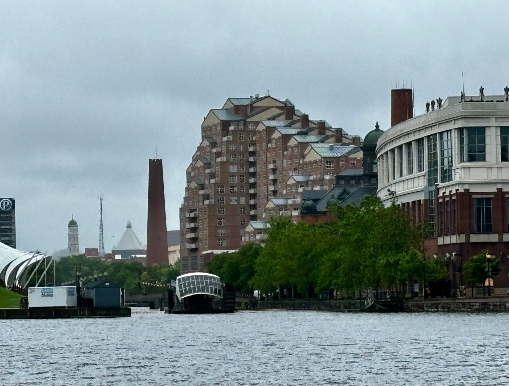 At the close of our cruise, we saw Mr. Trash Wheel. It is the vessel with the white grid at water level. The brainchild of local engineer John Kelley, it was installed in 2014. Mr. Trash is solar powered and collects trash at the mouth of the Jones Falls River as it empties into the harbor. As the wheel turns it collects all kinds of trash, 50 tons in its first year. The collected trash is stored and emptied regularly. It has been incredibly effective in removing, and keeping trash from the harbor. There is now a second iteration at another location in the inner harbor.