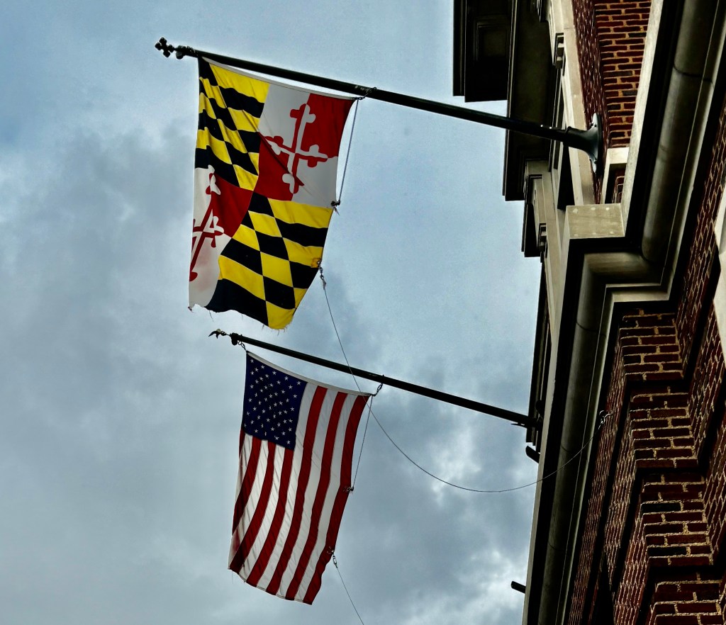 It is just an illusion of how I took the picture of the flags that the Maryland flag appears to be above the American flag. It wasn’t. However, I was interested in the Maryland flag and why it looks the way it does.