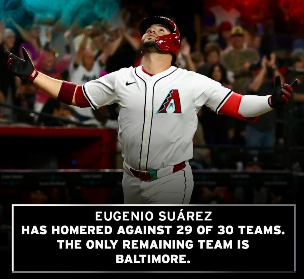 On Twitter, I saw this post about Eugenio Suarez. He was my favorite Mariner last year and was traded to the Diamondbacks in the off season. Logically, he is now my favorite Diamondback. The only team he hadn’t homered against in his career was the Baltimore Orioles.
