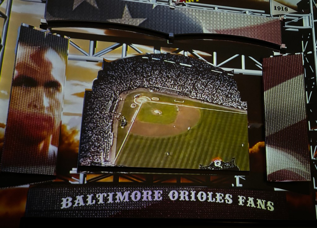 At the museum, a video showed a montage of celebrities singing different parts of the anthem. This video included Oriole fans.