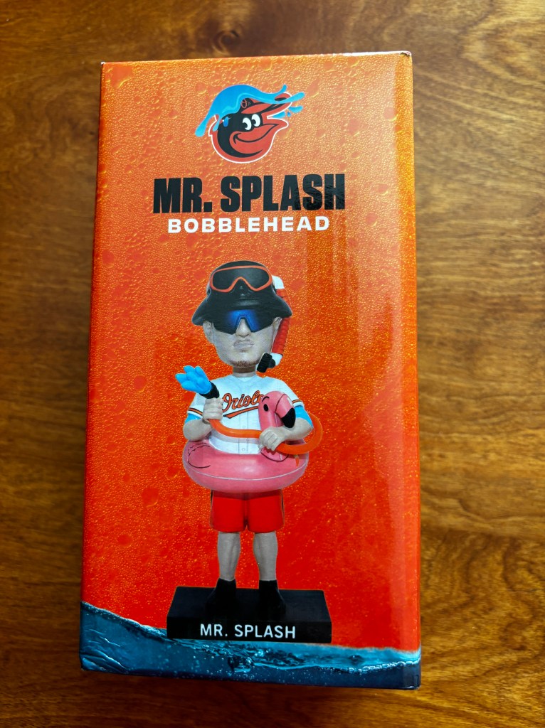 The Mr. Splash bobble-head represents a tradition of fans in a particular outfield section of the stadium getting sprayed with water at times during the game. The O’s team owner was Mr. Splashy that cold and chilly night.