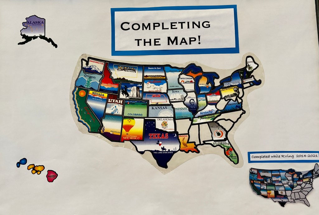 We were on our way to Harpers Ferry, situated on the eastern tip of West Virginia. (No apostrophe is correct.) West Virginia was one of the four states we were visiting to be able to place stickers on our old RV map.