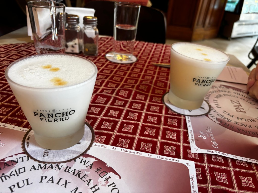 A little later we wandered off in search of a traditional Peruvian meal and found a restaurant that seemed to fit our needs. We started out with the traditional Peruvian drink, Pisco Sours. They were very good.