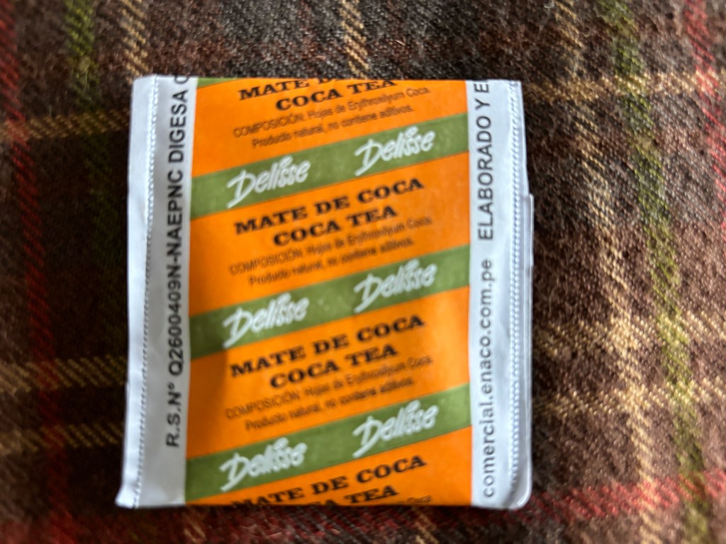 A cup of coca tea has more calcium than seven cups of milk. Yet, coca tea is not allowed in the US because of the possibility of homemade cocaine. Sniffing dogs are always present when flights arrive from this area and they will cue on coca leaves – even the random tea bag from a tourist in Cusco. (Some coca tea was accidentally spilled on my backpack along the way – I made sure I washed it well before we flew home.)