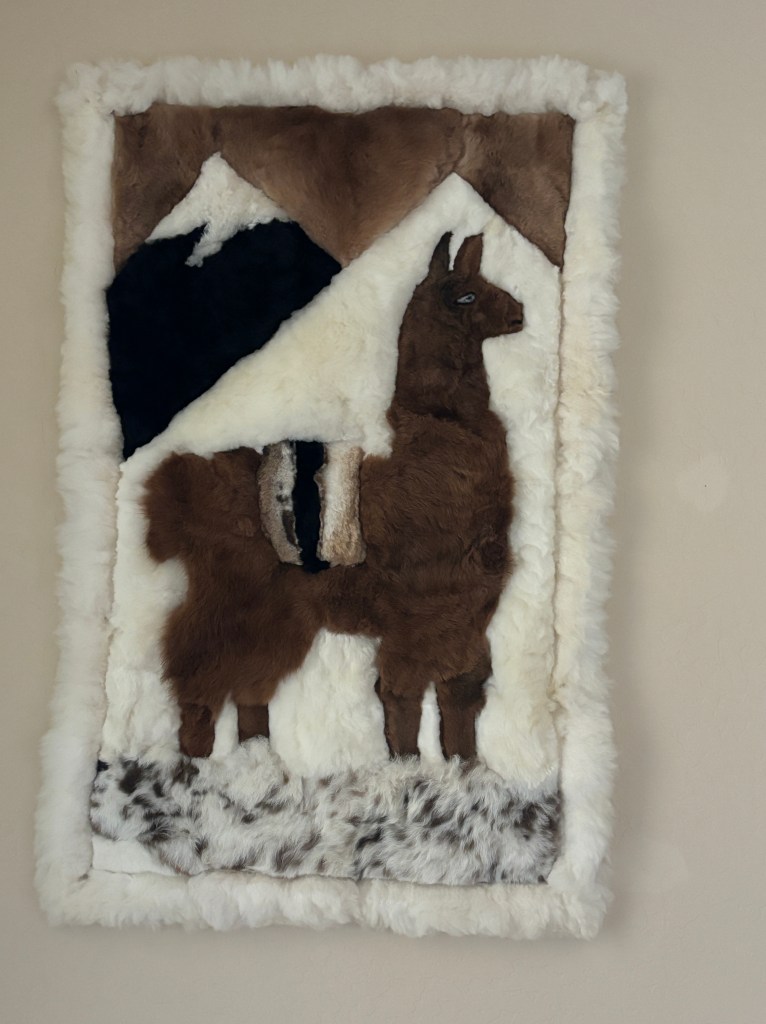 We bought this alpaca wall hanging even though we had to carry it around! It is reminiscent of our trip and of former family heirlooms or sorts. My parents lived in Panama in the early 1980 and bought family members large llama wall hangings. Only a couple are left after 40 plus years and they are in marginal condition.