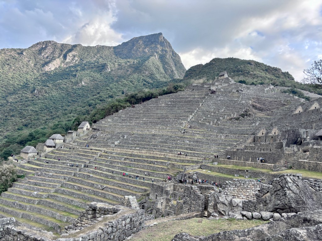 The Inca people grew crops on these terraces – primarily casaba tapioca root. They would use the Inca trail to trade for potatoes and quinoa with other groups. The terraces were outside the walled city. The houses on the left side were graineries.