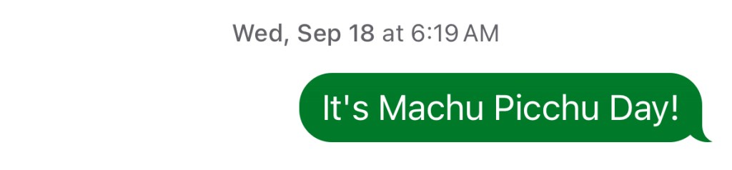 I sent this text to numerous friends and family on the morning of September 18. Of course, September 18 was also the day we went to the Inca Fortress and village that I wrote about last time – but the main event of the day was Machu Picchu.
