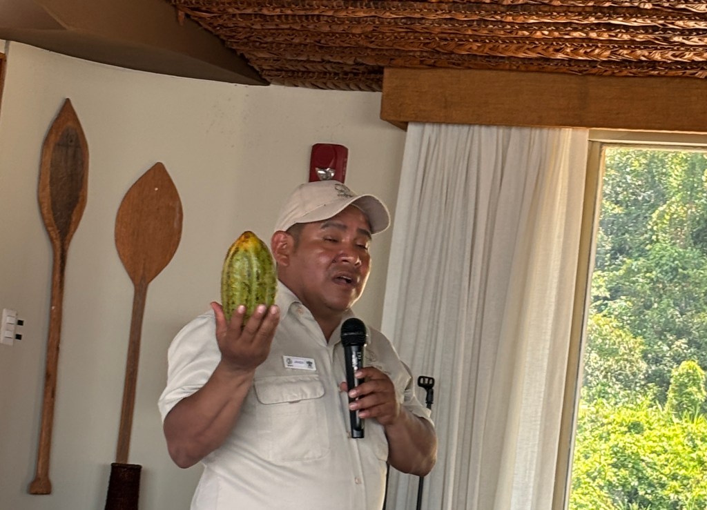 This large green fruit – macambo – is a relative of the cacao bean but evolved differently in the Amazon. The white colored pods can be roasted and have antioxidant value. The type of cacao for chocolate was developed by the Mayan culture in Mexico.