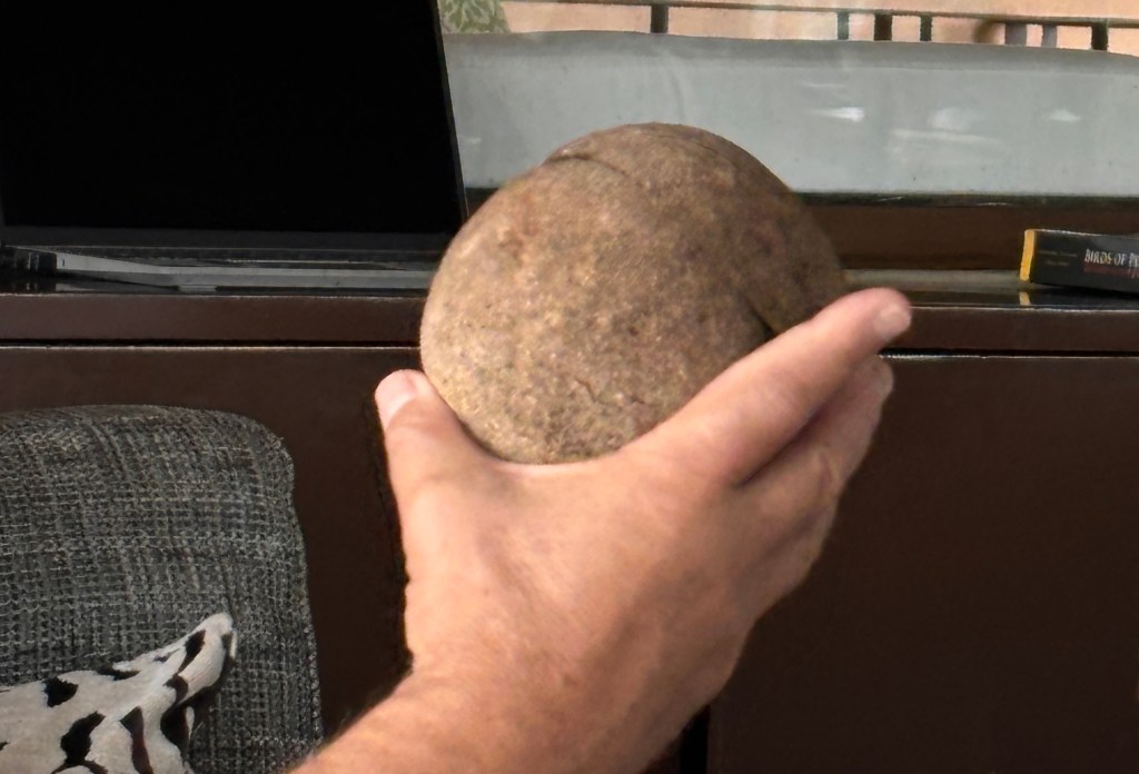 This is a brazil nut shell that has been cut. The nuts we are familiar with form inside this shell.