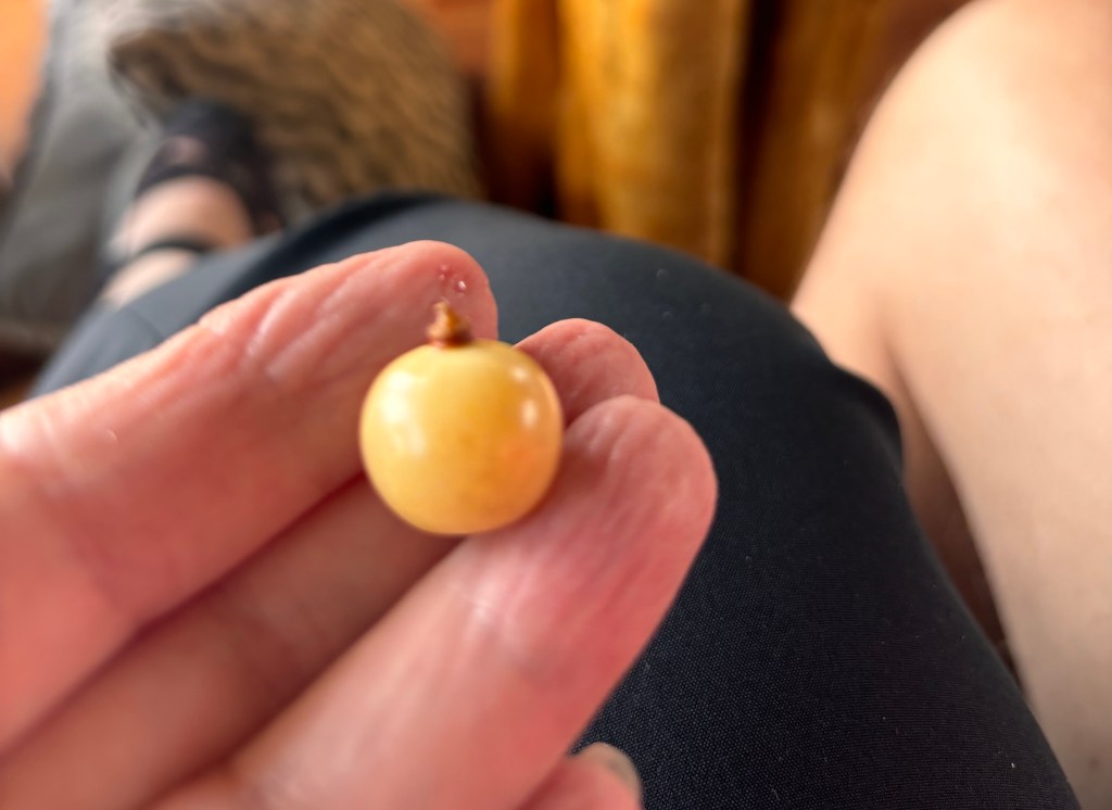 White grenadilla is a fruit in the passion fruit family. It is sweeter than the passion fruit we are used to. It has an interesting texture and neither of us cared for it.