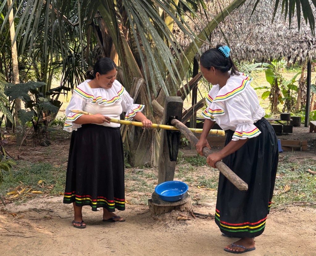 These women were demonstrating how they get juice from sugar cane.