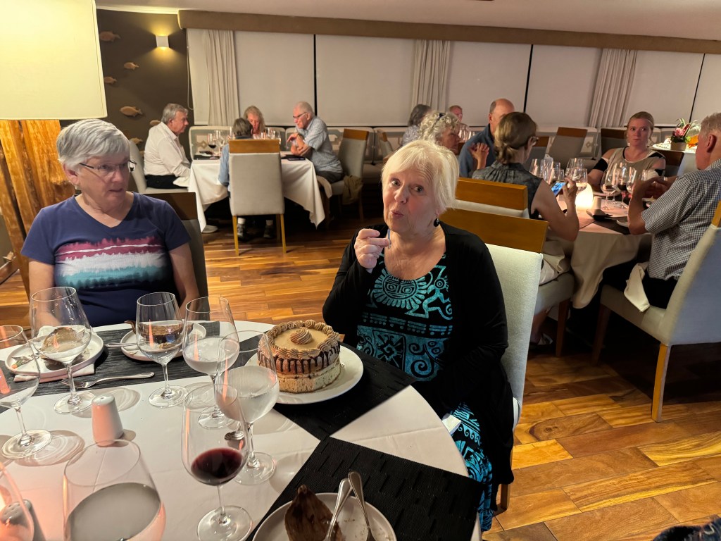 After dinner, the chef and waiters acknowledged two passengers having birthdays in a day or two after disembarking. That would be me!