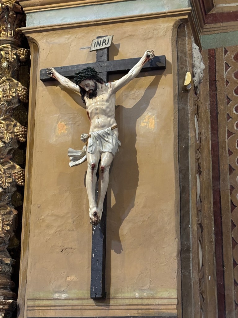 While observing this figure of Christ looking down with eyes closed, we were told that after accepting Jesus Christ, Mestizos would often display him this way with his head down and eyes open. That was perceived that he was looking down at their Mother Earth, pachu-mama. The Catholic Church forbade this, insisting that Jesus be portrayed in death looking down with his eyes closed or looking up to his father in heaven with his eyes open.