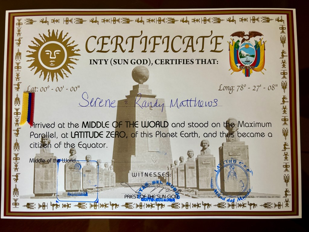 We were once again traveling on the Pan-American Highway as we journeyed. The monument on the hill was placed by the ancient people 1300 years ago and is evidence that they were knowledgable about the sun’s path on the equator.