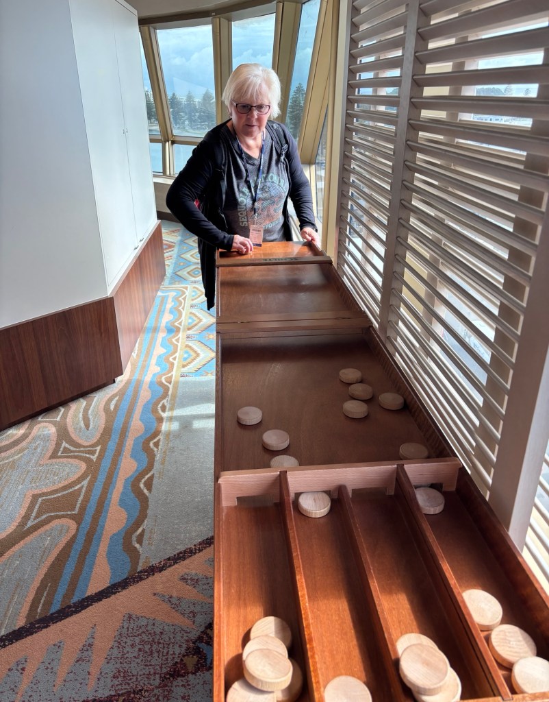 We went up to the Crow’s Nest and found an old friend! My family learned this game we called “shu-buck” from a Dutch family when we lived in Bangkok. My parents ordered a board and discs that we had for many years. Randy eventually made one for our family and we don’t remember what ultimately happened to it. On board, it is called a “sjoelen .” There was a competition on board but I didn’t participate. Was 50 plus years of experience too much of an advantage to exploit?