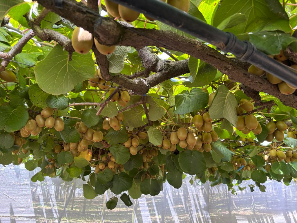 These gold kiwi are just a few weeks into their development. Even though they are already the size of what we typically see in our neighborhood grocery stores, they will double in size and be classified as Grade A. This classification level of crop primarily goes to Asia.