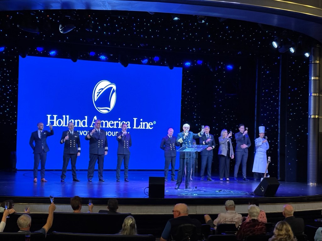 Then we went to the captain’s welcome toast. He gave us a little information that the Westerdam had her maiden voyage in 2004. The captain’s career began with Holland America in 1992. He introduced his senior officers and gave a toast to our journey.