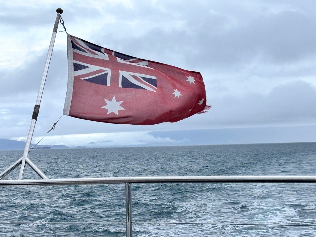 I noticed that the Australian flag on the boat was on a red background, not blue. I was told that boats fly the red flag so it will be more visible on the water.