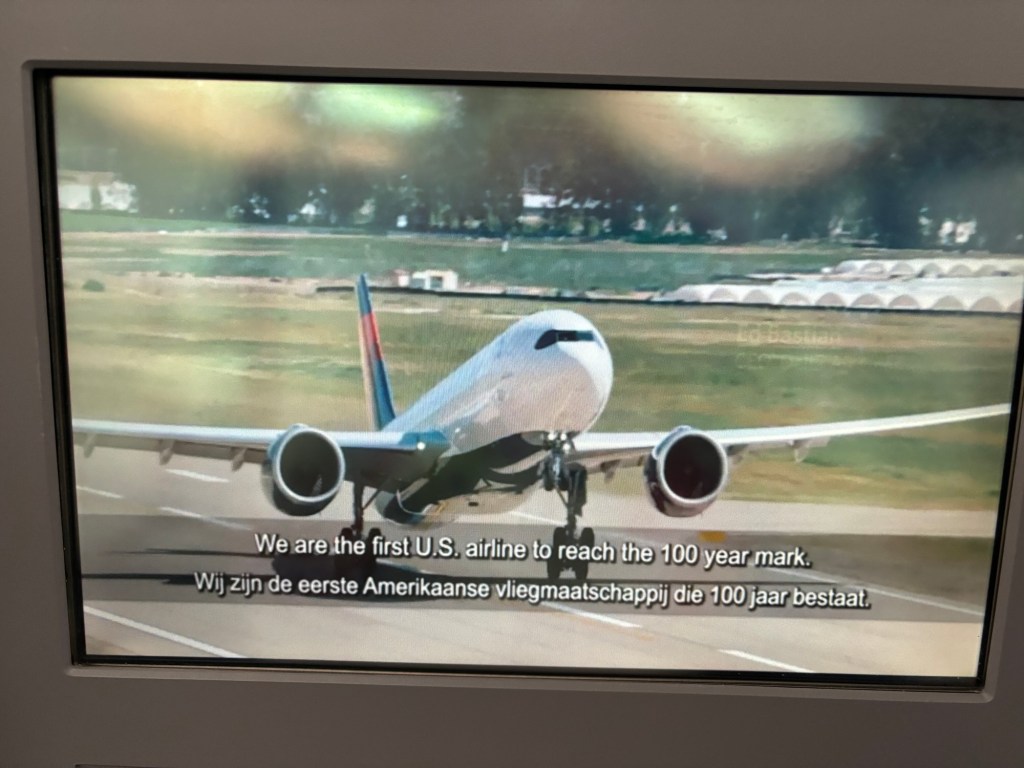 The pre-flight safety video highlighted Delta as the first airline to 100 years old. Segments were presented by people in period outfits by decade.