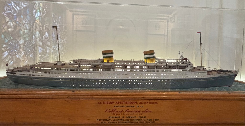 A scale model within the hotel shows Holland America’s SS Nieuw Amsterdam, built in 1938, as a luxury liner. It was painted gray and stripped down to be a troop shift during World War II. Because of its speed and strength, it sailed without convoy between the United States and Great Britain.