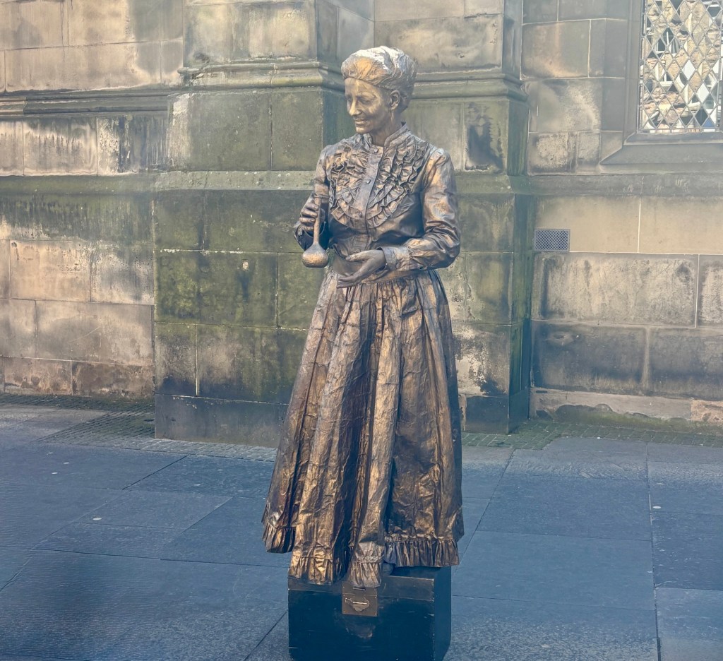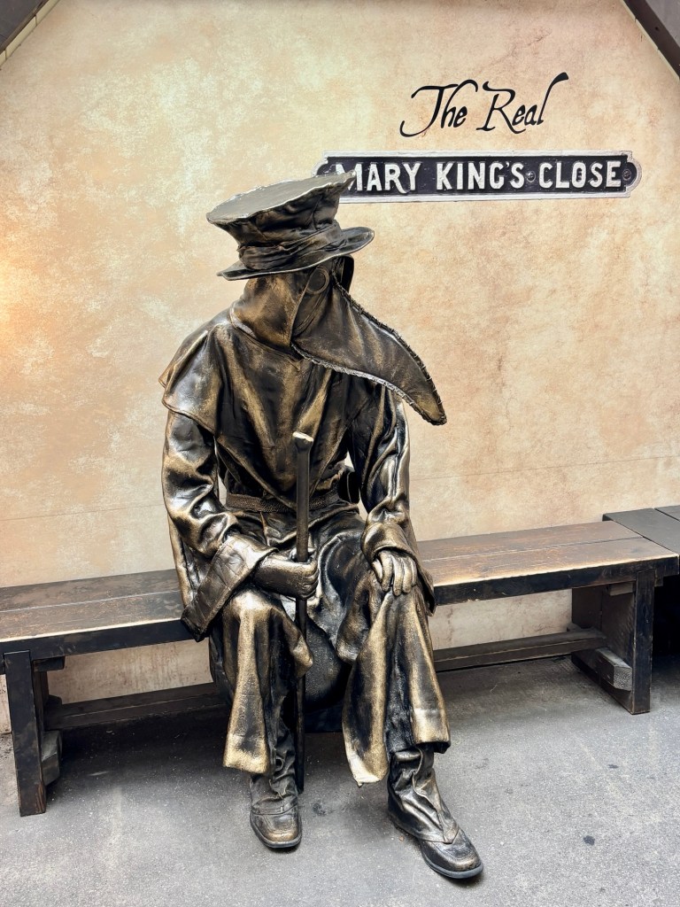 We left the coach and walked a few hundred yards to tour Mary King’s Close – a network of narrow underground alleys and abandoned houses that have been beneath the Royal Mile since the 17th century. Closes were private community streets which were locked at night. The wealthy lived in the top floors where the light could enter their homes. The poorest lived in the dark underground with livestock and open sewers. .