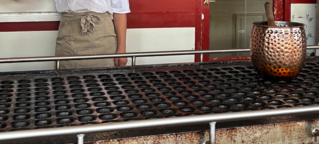 We’d had a coffee/tea stop early on, but our first food stop was for poffertjes. Oh my, they were delicious. They are little circular puffy pancakes with a little butter and a whole lot of powdered sugar. We haven’t had that much powdered sugar since Cafe du Mond in the French Quarter in New Orleans when we had beignets. The poffertjes were so good!
