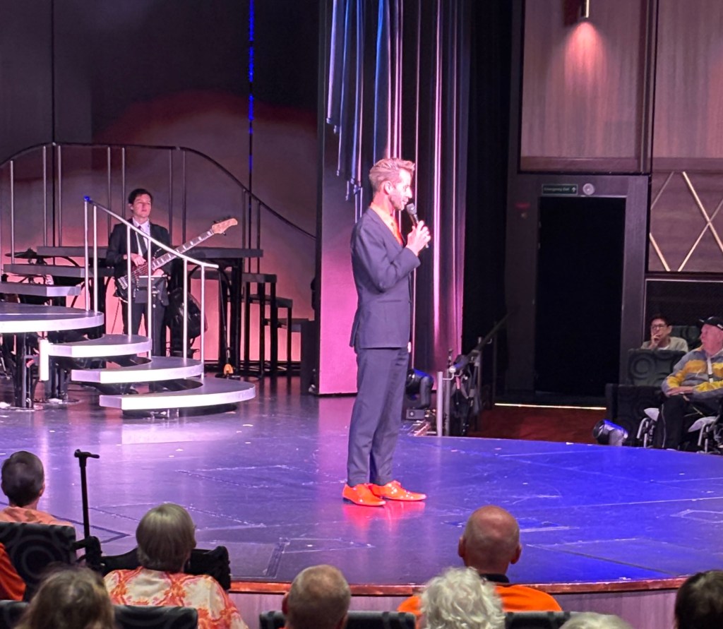 Tjalling may be the best cruise director we’ve ever had, but it isn’t his life goal to stay in this position.  (Notice his orange shoes later in the cruise on Orange Night!)