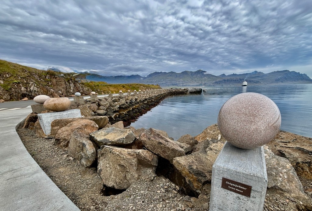 Enticed by this picture from our introductory talk on Djupivore aboard ship, we went in search of the Eggs of Merry Bay by Sigurõur Guốmundsson. Revealed in 2009, 34 eggs each represent one of the local birds.