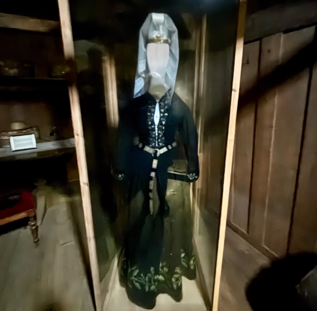 This was a traditional wedding dress, displayed in one of the darker rooms.