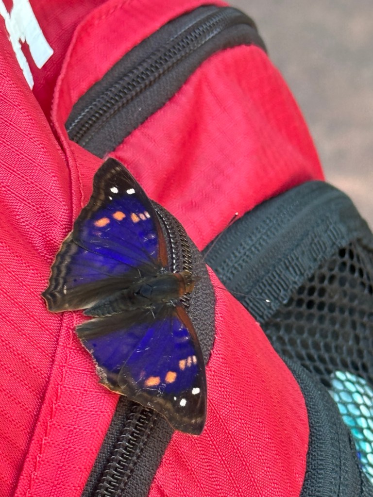 There were several types of butterflies around – this one was attracted to the red on my backpack.