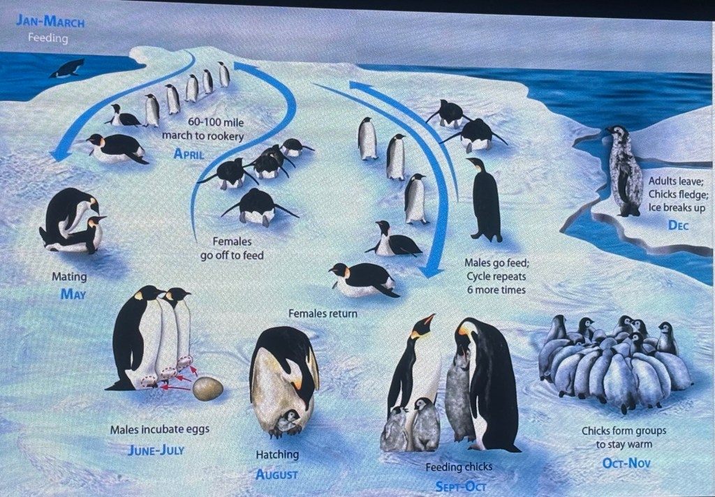 This generally shows the penguin life cycle but climate change is altering timing and impacting the survival of the chicks. The Gentoo species is highly adaptable and is taking advantage of climate change circumstances but it is to the detriment of the Adélie and Chinstrap.