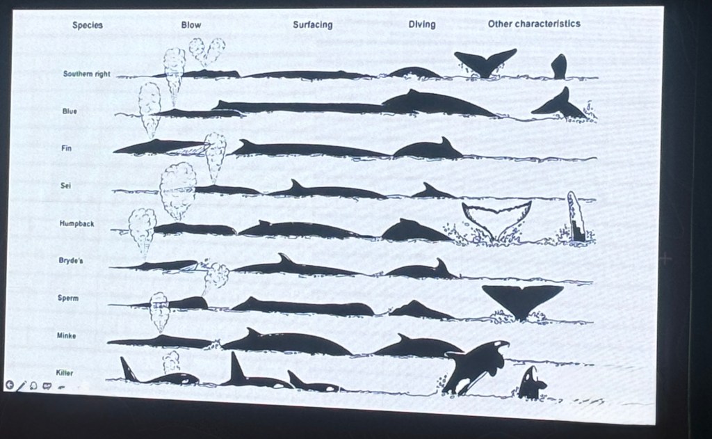 He said we will likely see humpback and Minke whales. There are four types of Orca in the southern hemisphere.